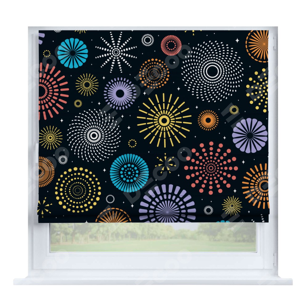 Римская штора производителя «Cortin», устанавливается на створку окна, пошита из ткани блэкаут с нанесением сублимационной печати «Праздничный фейерверк». Штора шьётся по индивидуальным размерам, для данного типа римской шторы возможная ширина от 35 до 150 см., высота до 250 см.