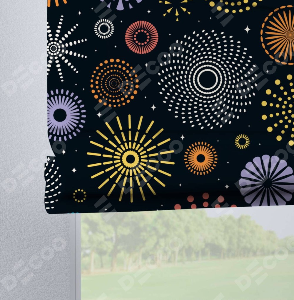 Римская штора производителя «Cortin», используется для проёма, пошита из ткани блэкаут с нанесением сублимационной печати «Праздничный фейерверк». Данная модель пошита на петлях, комплектуется на выбор круглым карнизом и подходит для монтажа на стену. Римская штора на петлях имеет простую систему регулировки высоты, отличительным преимуществом данной модели является простой способ монтажа. Достаточно повесить ее на трубу и штора готова!