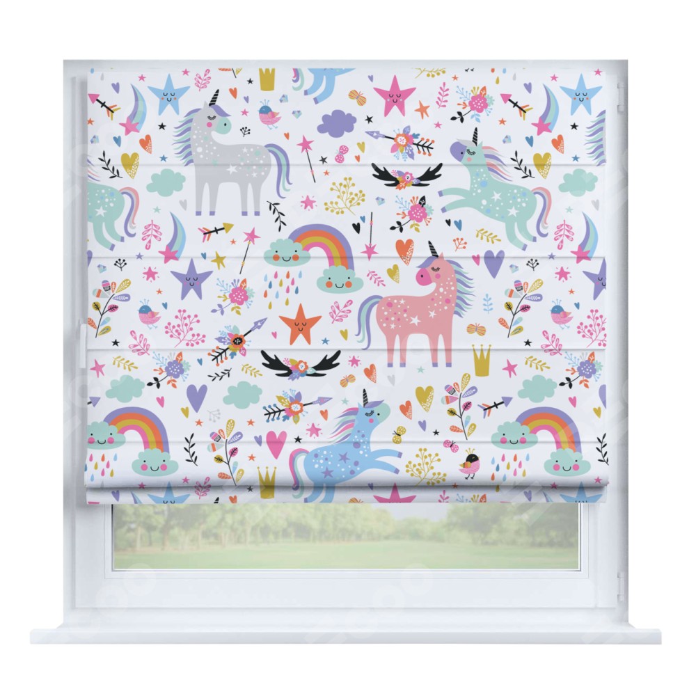 Римская штора производителя «Cortin», устанавливается на створку окна, пошита из ткани блэкаут с нанесением сублимационной печати «Радужные единороги». Штора шьётся по индивидуальным размерам, для данного типа римской шторы возможная ширина от 35 до 150 см., высота до 250 см.