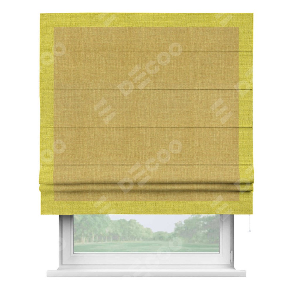 Римская штора производителя «Cortin», используется для проёма, пошита из ткани лён горчичный, артикул 74740. Отделка шторы кантом «Чесс», ткань для канта используется из льна разной расцветки на выбор. Имеет универсальный механизм и подходит для монтажа: на потолок, на стену и в нишу.