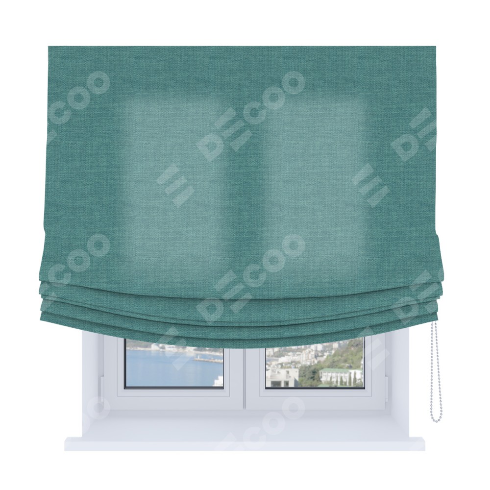 Римская штора Soft производителя «Cortin», используется для проёма, пошита из ткани лён бирюза, артикул ткани 7446. Имеет универсальный механизм и подходит для монтажа: на потолок, на стену и в нишу. В отличие от стандартных римских штор, римская штора Soft не имеет горизонтальных вставок и нижнего отвеса. Это позволяет ткани произвольно драпироваться в свободные мягкие складки.