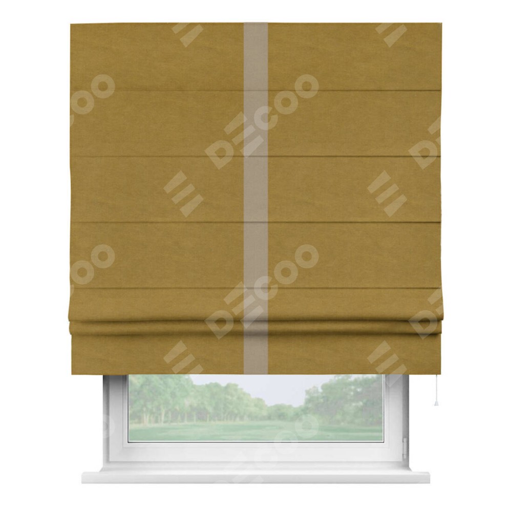 Римская штора производителя «Cortin», используется для проёма, пошита из ткани вельвет светло-коричневый, артикул ткани 4973. Отделка шторы кантом «Хайвей», ткань для канта используется из вельвета разной расцветки на выбор. Имеет универсальный механизм и подходит для монтажа: на потолок, на стену и в нишу.