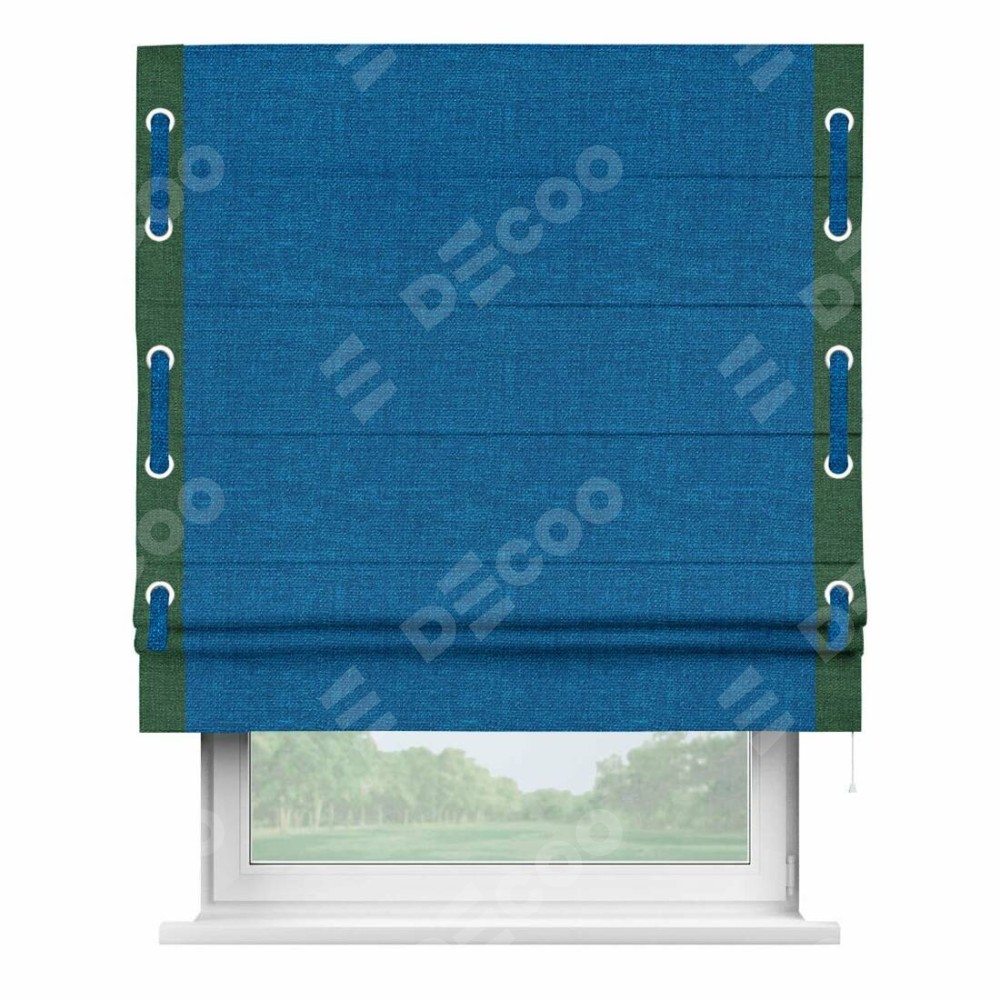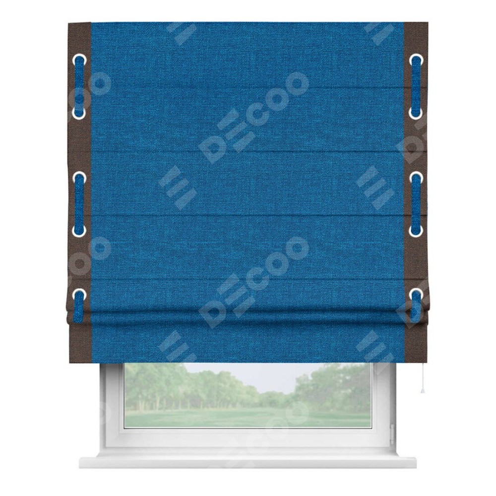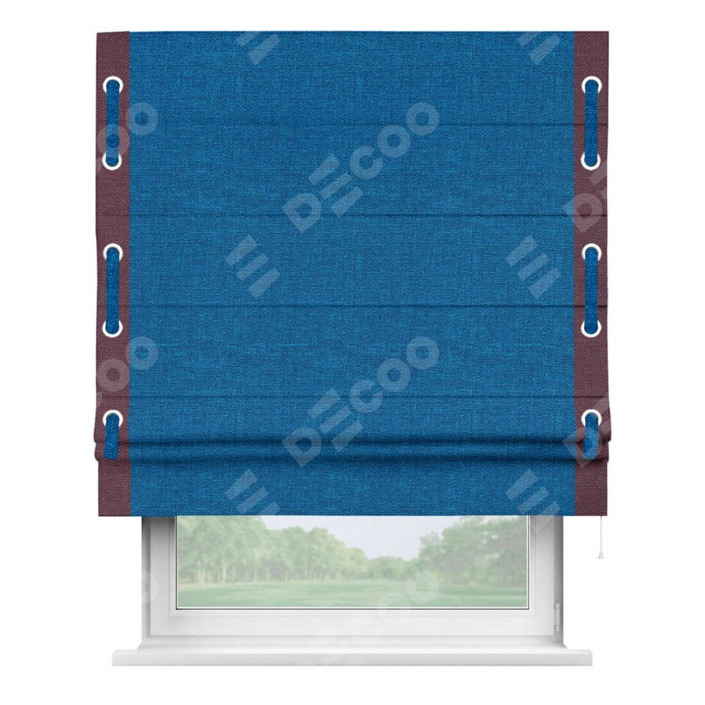 Римская штора производителя «Cortin», используется для проёма, пошита из ткани лён синий, артикул 63742. Отделка шторы кантом «Стрим Дуо» на кантах расположены люверсы с пояском, ткань для канта используется из льна разной расцветки на выбор. Ткань для пояска обычно используется из основной ткани шторы, а так же можно сделать из любой расцветки по желанию. Имеет универсальный механизм и подходит для монтажа: на потолок, на стену и в нишу.