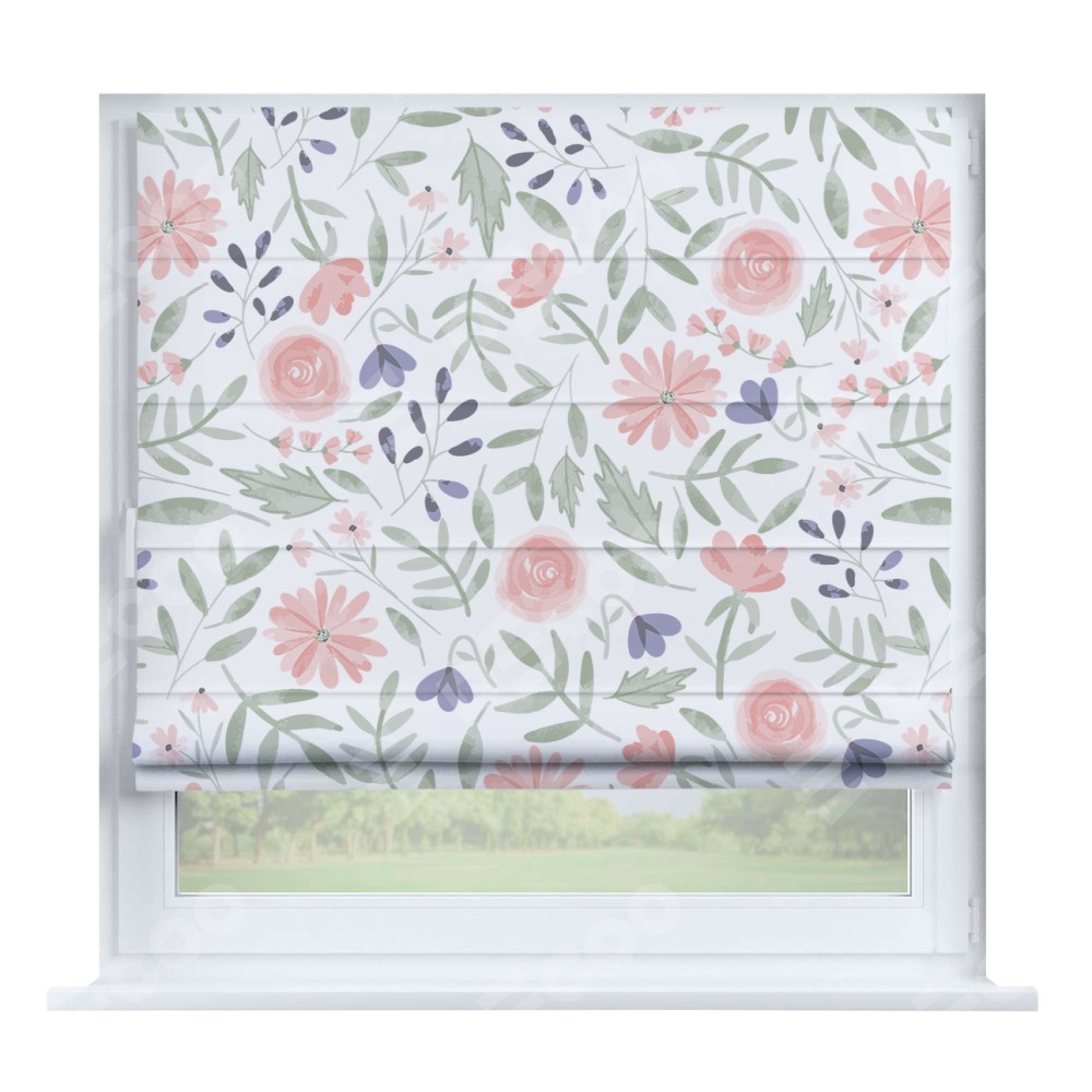 Римская штора производителя «Cortin», устанавливается на створку окна, пошита из ткани блэкаут с нанесением сублимационной печати «Изысканные цветы». Штора шьётся по индивидуальным размерам, для данного типа римской шторы возможная ширина от 35 до 150 см., высота до 250 см.
