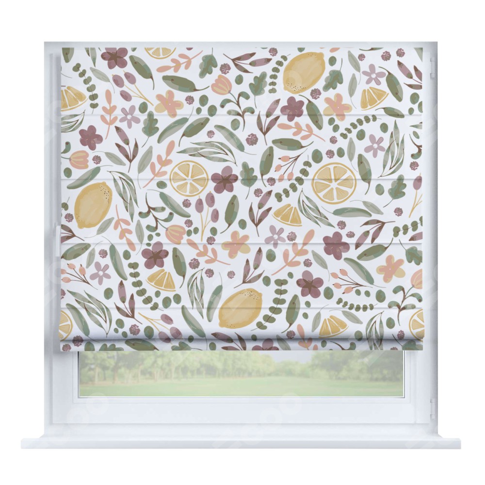 Римская штора производителя «Cortin», устанавливается на створку окна, пошита из ткани блэкаут с нанесением сублимационной печати «Лимоны и цветы». Штора шьётся по индивидуальным размерам, для данного типа римской шторы возможная ширина от 35 до 150 см., высота до 250 см.