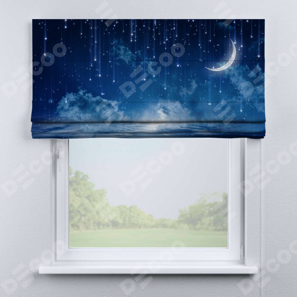 Римская штора производителя «Cortin», используется для проёма, пошита из ткани блэкаут с нанесением сублимационной печати «Ночное небо». Имеет универсальный механизм и подходит для монтажа: на потолок, на стену и в нишу.
