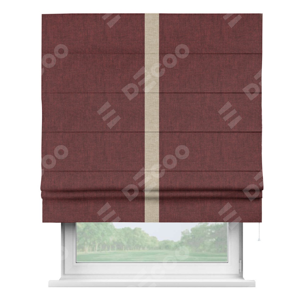 Римская штора производителя «Cortin», используется для проёма, пошита из ткани лён кашемир бордовый, артикул 17213. Отделка шторы кантом «Хайвэй», ткань для канта используется из льна разной расцветки на выбор. Имеет универсальный механизм и подходит для монтажа: на потолок, на стену и в нишу.