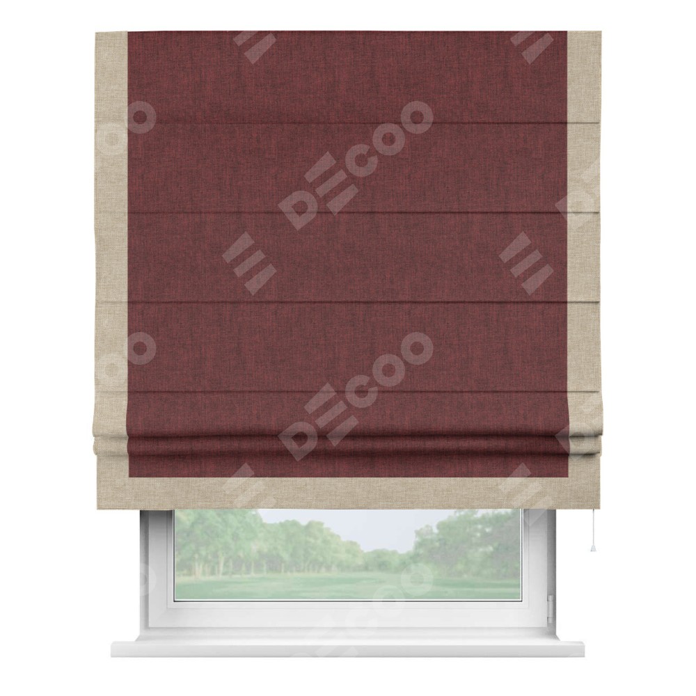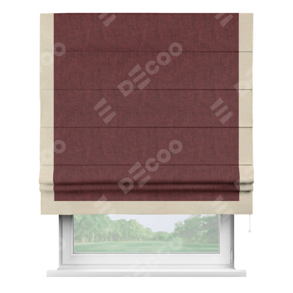 Римская штора производителя «Cortin», используется для проёма, пошита из ткани лён кашемир бордовый, артикул 17213. Отделка шторы кантом «Виктория», ткань для канта используется из льна разной расцветки на выбор. Имеет универсальный механизм и подходит для монтажа: на потолок, на стену и в нишу.
