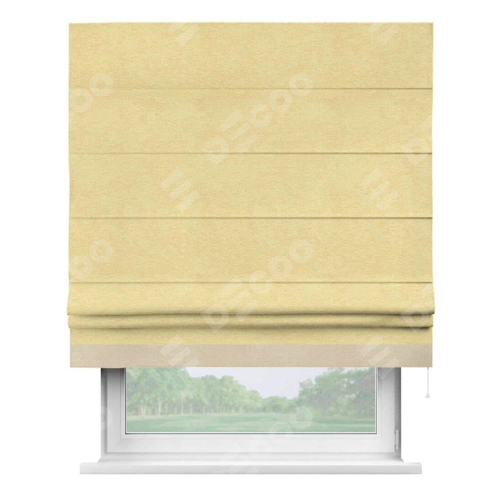Римская штора производителя «Cortin», используется для проёма, пошита из ткани софт однотонный золотой, артикул 42934. Отделка шторы кантом «Джестер», ткань для канта используется из софта разной расцветки на выбор. Имеет универсальный механизм и подходит для монтажа: на потолок, на стену и в нишу.