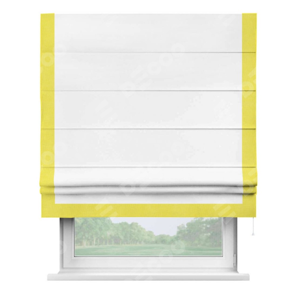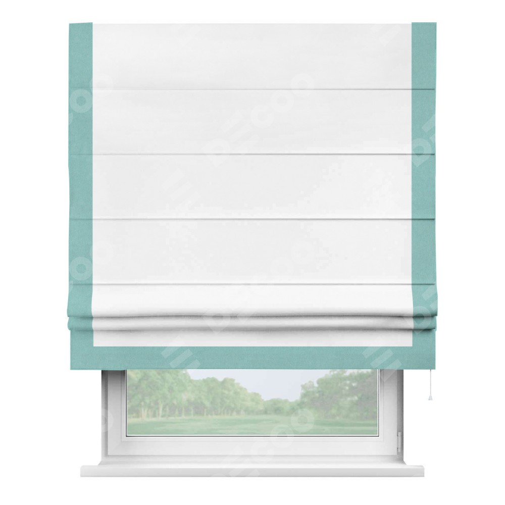 Римская штора производителя «Cortin», используется для проёма, пошита из ткани вельвет белоснежный, артикул ткани 19192. Отделка шторы кантом «Виктория», ткань для канта используется из вельвета разной расцветки на выбор. Имеет универсальный механизм и подходит для монтажа: на потолок, на стену и в нишу.