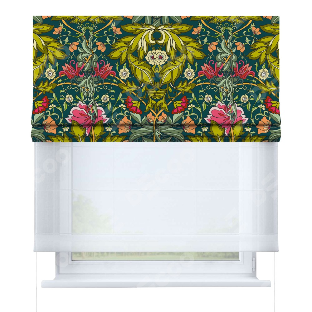 Римская штора день-ночь производителя «Cortin», используется для проёма, пошита из двух полотен, с лицевой блэкаут с нанесением сублимационной печати «Цветок морриса», вторая ткань тюль (по стандарту комплектуется тюль белого цвета артикул V-01). Имеет универсальный механизм и подходит для монтажа: на потолок, на стену и в нишу.