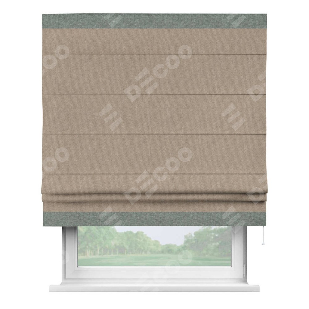 Римская штора производителя «Cortin», используется для проёма, пошита из ткани лён димаут светло-бежевый, артикул 00002. Отделка шторы кантом «Горизонт», ткань для канта используется из льна димаут разной расцветки на выбор. Имеет универсальный механизм и подходит для монтажа: на потолок, на стену и в нишу.