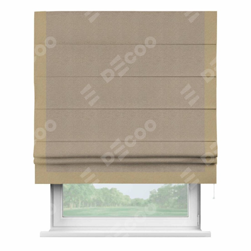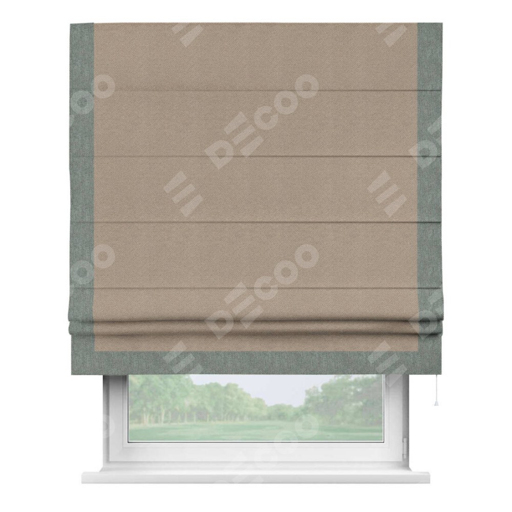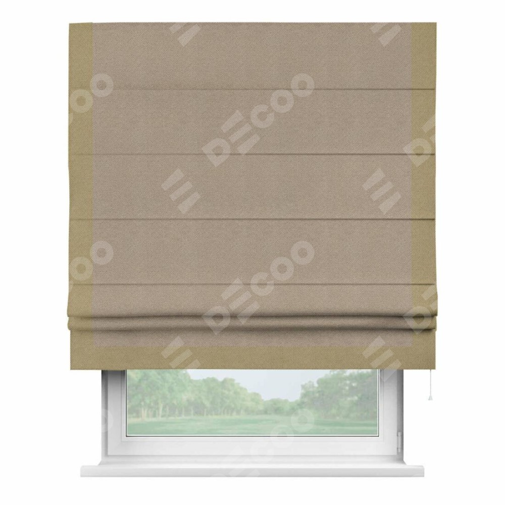 Римская штора производителя «Cortin», используется для проёма, пошита из ткани лён димаут светло-бежевый, артикул 00002. Отделка шторы кантом «Виктория», ткань для канта используется из льна димаут разной расцветки на выбор. Имеет универсальный механизм и подходит для монтажа: на потолок, на стену и в нишу.