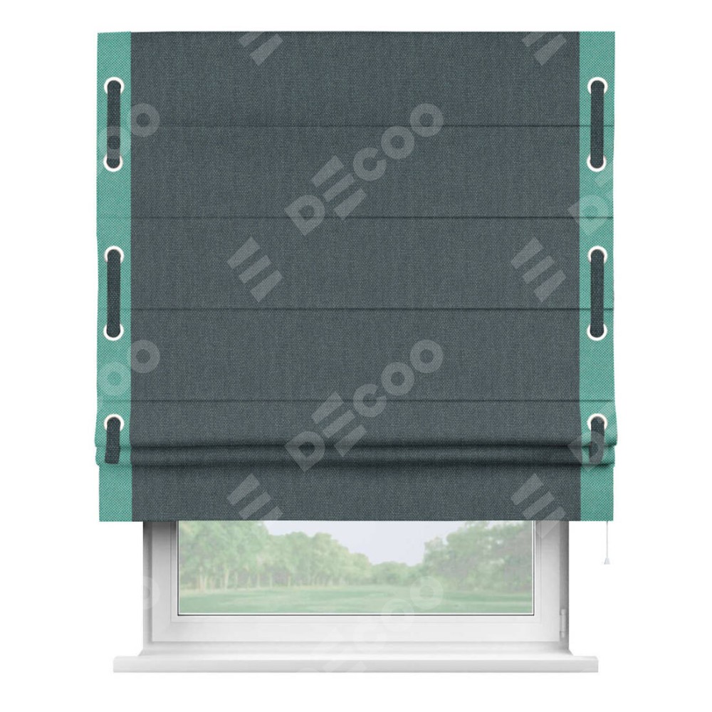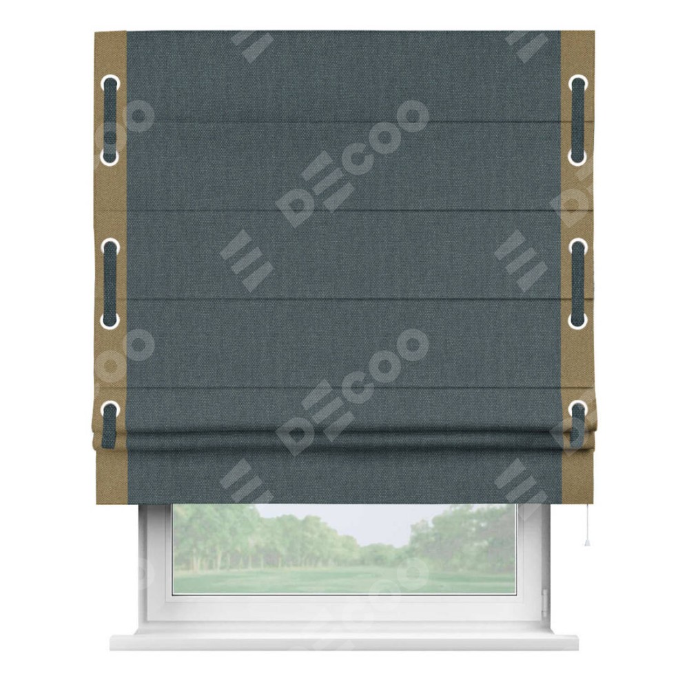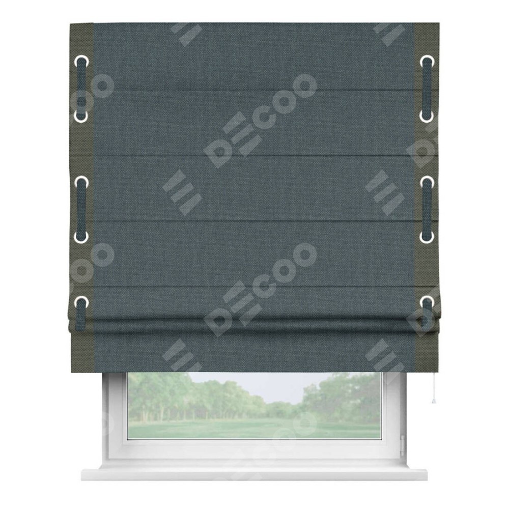 Римская штора производителя «Cortin», используется для проёма, пошита из ткани лён димаут серо-синий, артикул 03238. Отделка шторы кантом «Стрим Дуо» на кантах расположены люверсы с пояском, ткань для канта используется лён димаут разной расцветки на выбор. Ткань для пояска обычно используется из основной ткани шторы, а так же можно сделать из любой расцветки по желанию. Имеет универсальный механизм и подходит для монтажа: на потолок, на стену и в нишу.