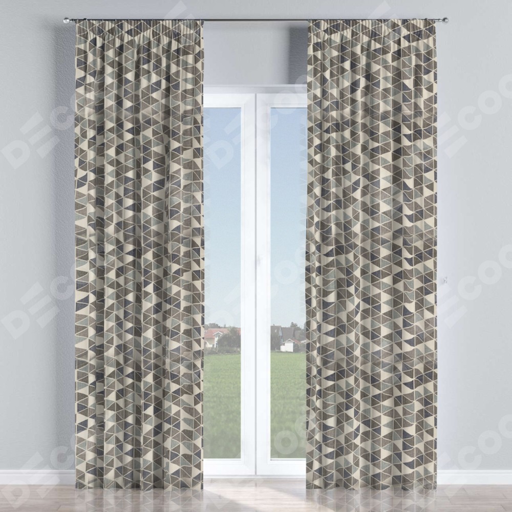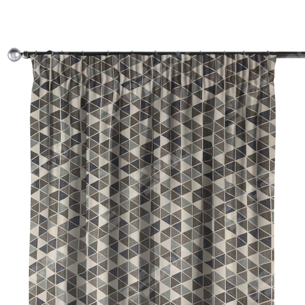 Комплект прямых штор, от производителя «Cortin», пошиты из ткани димаут «Треугольники синие», артикул ткани 23022. С изнаночной стороны в верхней части штор пристрачивается шторная лента с декоративными складками «Карандаш». Для создания элегантных складок прямые шторы шьются по стандарту с коэффициентом 1:2 (на 100 см. ширины проёма 200 см. ширины ткани).