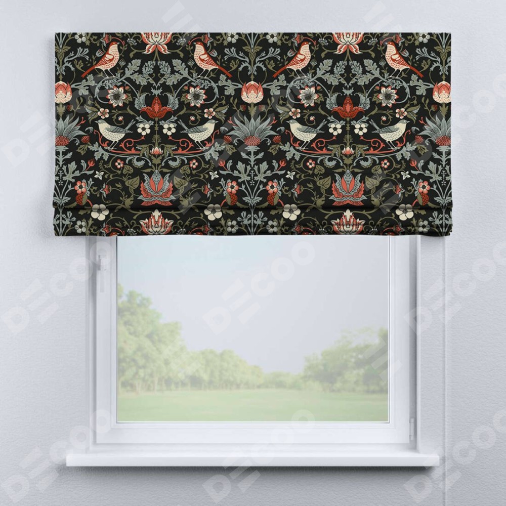 Римская штора производителя «Cortin», используется для проёма, пошита из ткани блэкаут с нанесением сублимационной печати «Зачарованные птицы». Имеет универсальный механизм и подходит для монтажа: на потолок, на стену и в нишу.