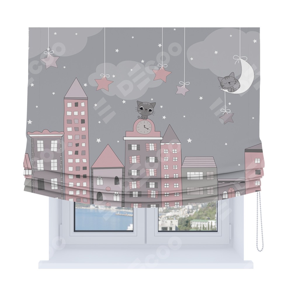Римская штора Soft производителя «Cortin», используется для проёма, пошита из ткани блэкаут с нанесением сублимационной печати «Вечерний город». Имеет универсальный механизм и подходит для монтажа: на потолок, на стену и в нишу. В отличие от стандартных римских штор, римская штора Soft не имеет горизонтальных вставок и нижнего отвеса. Это позволяет ткани произвольно драпироваться в свободные мягкие складки.