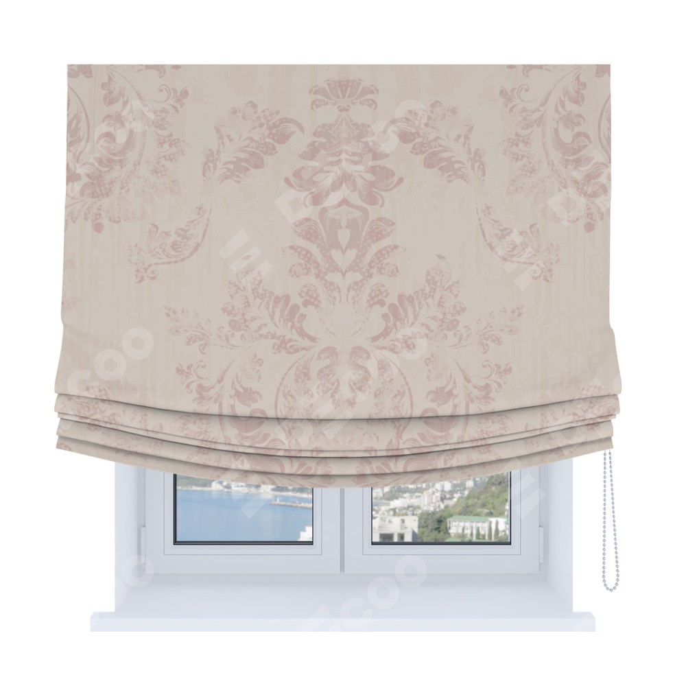Римская штора Soft производителя «Cortin», используется для проёма, пошита из ткани блэкаут с нанесением сублимационной печати «Винтажный узор пудровый». Имеет универсальный механизм и подходит для монтажа: на потолок, на стену и в нишу. В отличие от стандартных римских штор, римская штора Soft не имеет горизонтальных вставок и нижнего отвеса. Это позволяет ткани произвольно драпироваться в свободные мягкие складки.