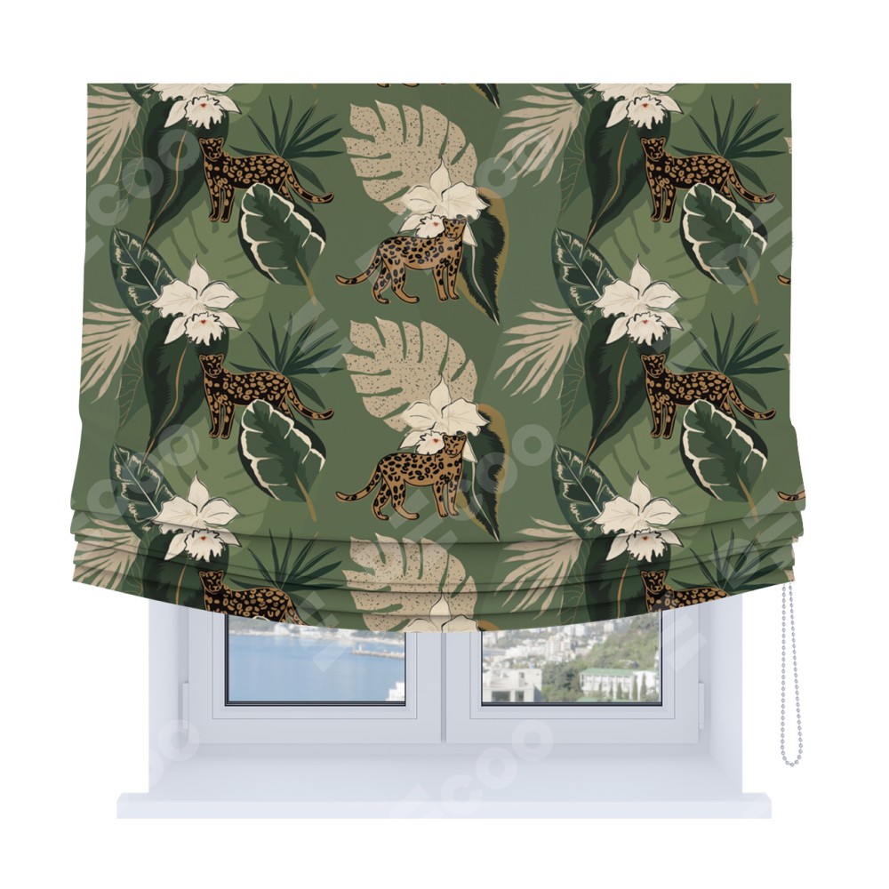 Римская штора Soft производителя «Cortin», используется для проёма, пошита из ткани блэкаут с нанесением сублимационной печати «В тропическом лесу». Имеет универсальный механизм и подходит для монтажа: на потолок, на стену и в нишу. В отличие от стандартных римских штор, римская штора Soft не имеет горизонтальных вставок и нижнего отвеса. Это позволяет ткани произвольно драпироваться в свободные мягкие складки.