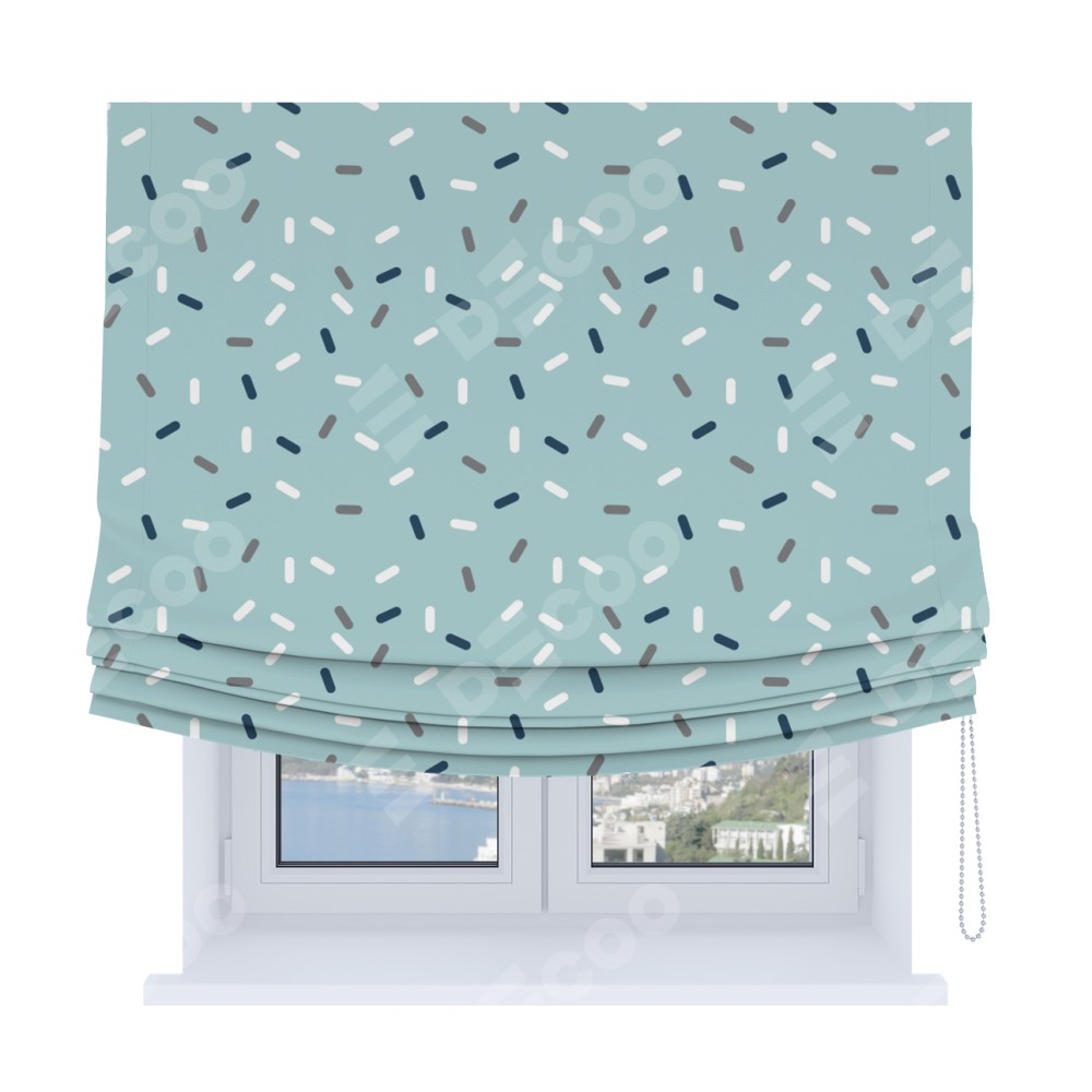 Римская штора Soft производителя «Cortin», используется для проёма, пошита из ткани блэкаут с нанесением сублимационной печати «Короткие линии». Имеет универсальный механизм и подходит для монтажа: на потолок, на стену и в нишу. В отличие от стандартных римских штор, римская штора Soft не имеет горизонтальных вставок и нижнего отвеса. Это позволяет ткани произвольно драпироваться в свободные мягкие складки.