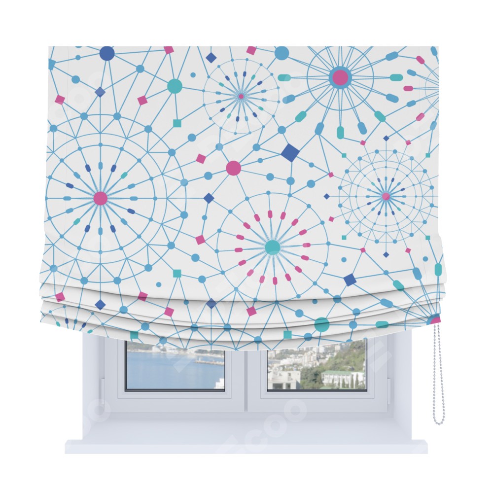 Римская штора Soft производителя «Cortin», используется для проёма, пошита из ткани блэкаут с нанесением сублимационной печати «Круги и линии». Имеет универсальный механизм и подходит для монтажа: на потолок, на стену и в нишу. В отличие от стандартных римских штор, римская штора Soft не имеет горизонтальных вставок и нижнего отвеса. Это позволяет ткани произвольно драпироваться в свободные мягкие складки.