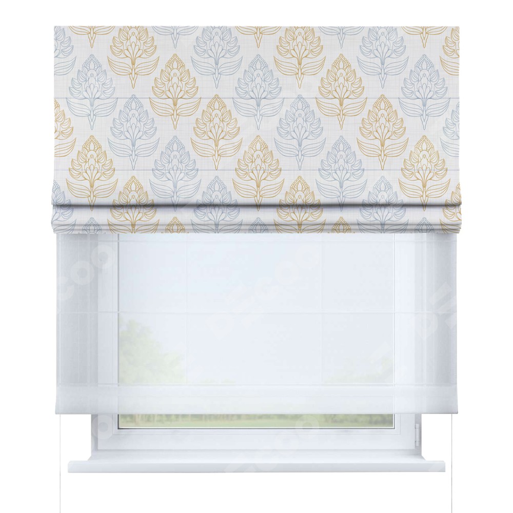 Римская штора день-ночь производителя «Cortin», используется для проёма, пошита из двух полотен, с лицевой блэкаут с нанесением сублимационной печати «Цветочный медальон», вторая ткань тюль (по стандарту комплектуется тюль белого цвета артикул V-01). Имеет универсальный механизм и подходит для монтажа: на потолок, на стену и в нишу.