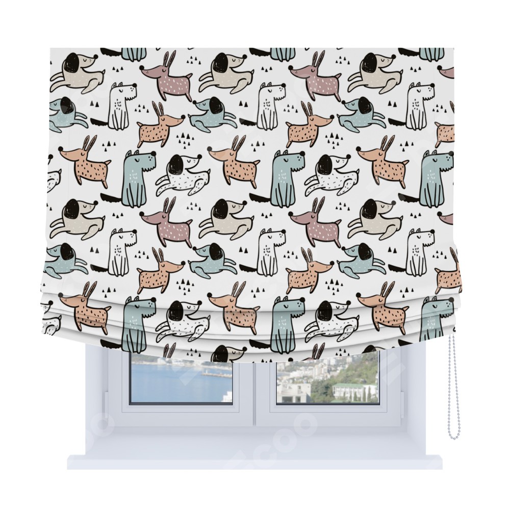 Римская штора Soft производителя «Cortin», используется для проёма, пошита из ткани блэкаут с нанесением сублимационной печати «Очаровательные щеночки». Имеет универсальный механизм и подходит для монтажа: на потолок, на стену и в нишу. В отличие от стандартных римских штор, римская штора Soft не имеет горизонтальных вставок и нижнего отвеса. Это позволяет ткани произвольно драпироваться в свободные мягкие складки.