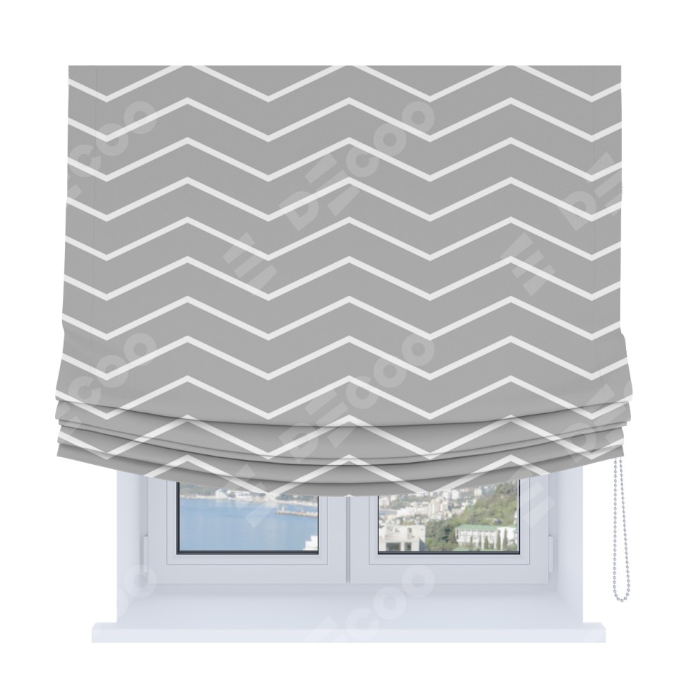 Римская штора Soft производителя «Cortin», используется для проёма, пошита из ткани блэкаут с нанесением сублимационной печати «Серый зигзаг». Имеет универсальный механизм и подходит для монтажа: на потолок, на стену и в нишу. В отличие от стандартных римских штор, римская штора Soft не имеет горизонтальных вставок и нижнего отвеса. Это позволяет ткани произвольно драпироваться в свободные мягкие складки.