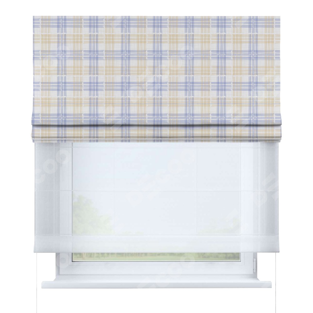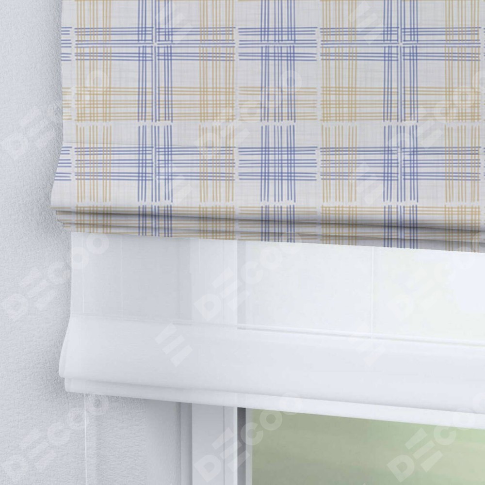 Римская штора день-ночь производителя «Cortin», используется для проёма, пошита из двух полотен, с лицевой блэкаут с нанесением сублимационной печати «Клетки кантри», вторая ткань тюль (по стандарту комплектуется тюль белого цвета артикул V-01). Имеет универсальный механизм и подходит для монтажа: на потолок, на стену и в нишу.