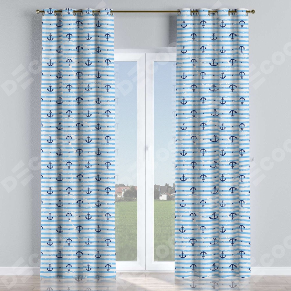 Комплект прямых штор, от производителя «Cortin», пошиты из ткани блэкаут с нанесением сублимационной печати «Полоски и якори». Данная модель пошита на люверсах, комплектуется на выбор круглым карнизом и подходит для монтажа на стену или потолок. Прямые шторы на люверсах шьются по стандарту с коэффициентом 1/2 (на 100 см. ширины проёма 200 см. ширины ткани), отличительным преимуществом данной модели является простой способ монтажа. Достаточно повесить ее на трубу и штора готова!