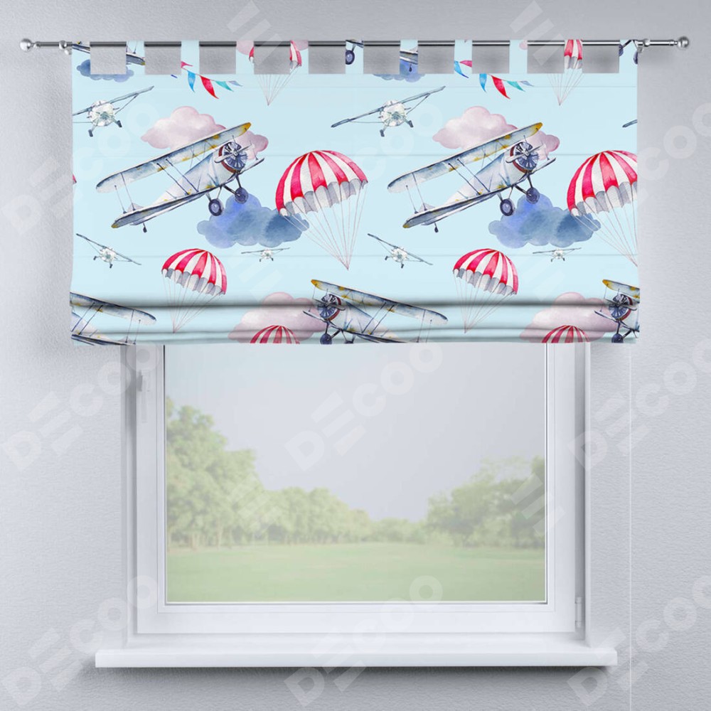 Римская штора производителя «Cortin», используется для проёма, пошита из ткани блэкаут с нанесением сублимационной печати «Самолет». Данная модель пошита на петлях, комплектуется на выбор круглым карнизом и подходит для монтажа на стену. Римская штора на петлях имеет простую систему регулировки высоты, отличительным преимуществом данной модели является простой способ монтажа. Достаточно повесить ее на трубу и штора готова!