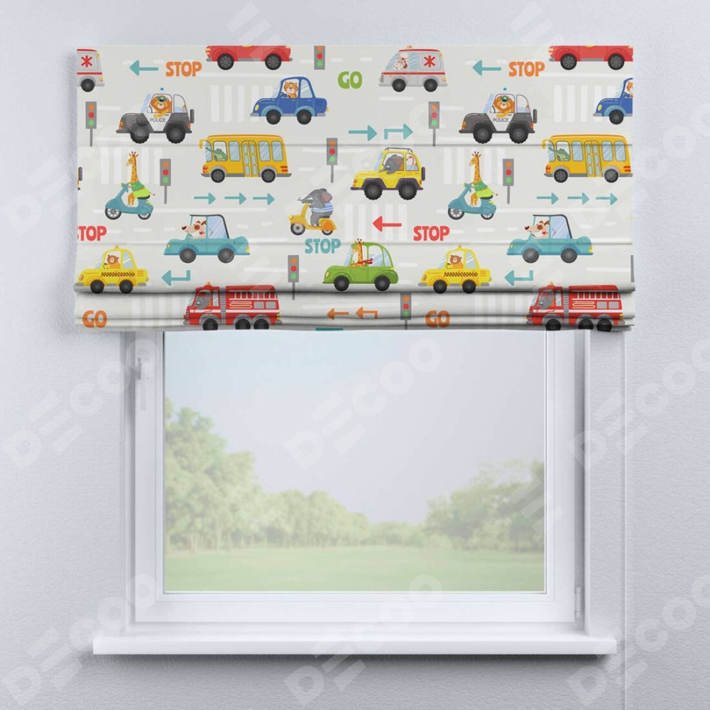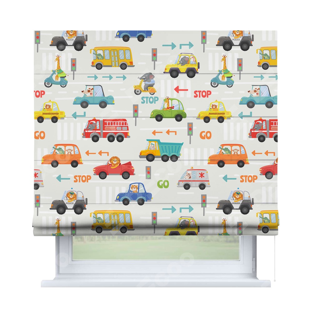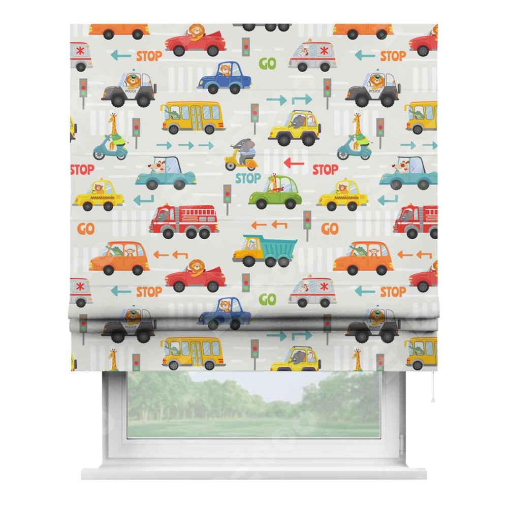 Римская штора производителя «Cortin», используется для проёма, пошита из ткани блэкаут с нанесением сублимационной печати «Дорожные правила». Имеет универсальный механизм и подходит для монтажа: на потолок, на стену и в нишу.