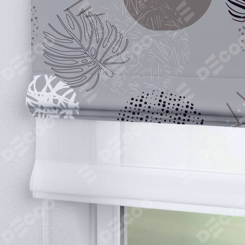 Римская штора день-ночь производителя «Cortin», используется для проёма, пошита из двух полотен, с лицевой блэкаут с нанесением сублимационной печати «Ботаника абстракция», вторая ткань тюль (по стандарту комплектуется тюль белого цвета артикул V-01). Имеет универсальный механизм и подходит для монтажа: на потолок, на стену и в нишу.