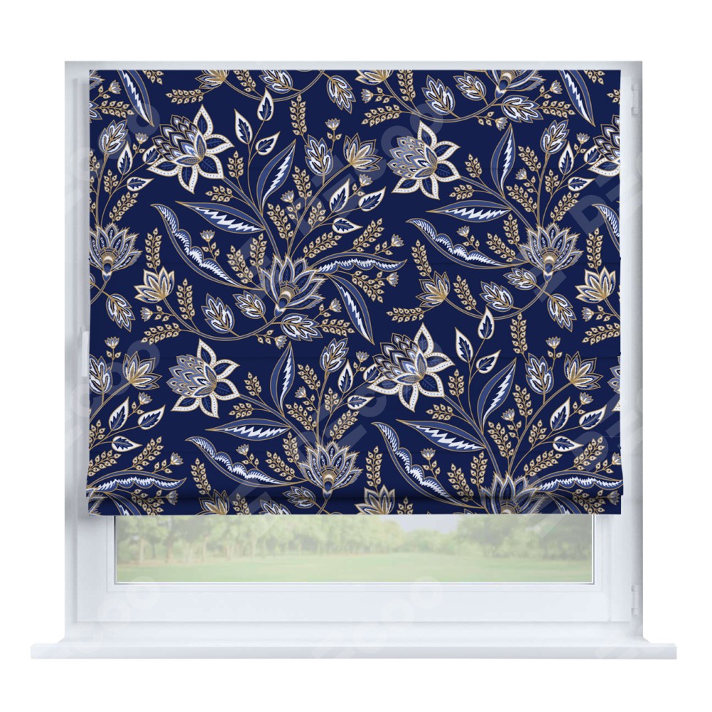 Римская штора производителя «Cortin», устанавливается на створку окна, пошита из ткани блэкаут с нанесением сублимационной печати «Индиго батик». Штора шьётся по индивидуальным размерам, для данного типа римской шторы возможная ширина от 35 до 150 см., высота до 250 см.