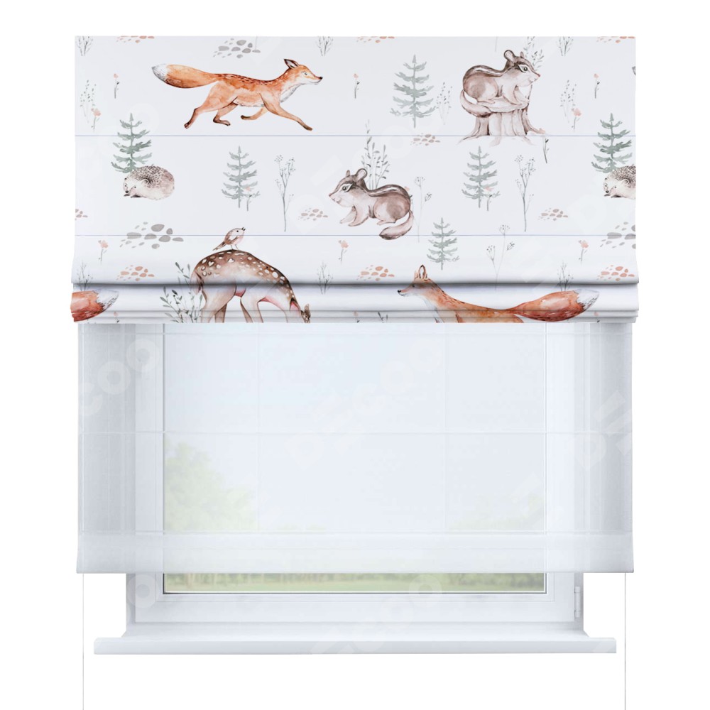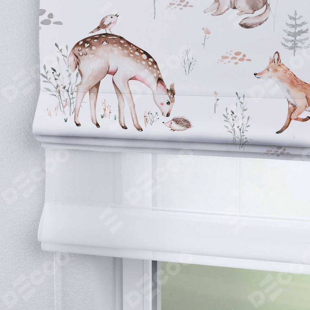 Римская штора день-ночь производителя «Cortin», используется для проёма, пошита из двух полотен, с лицевой блэкаут с нанесением сублимационной печати «Пушистый питомник», вторая ткань тюль (по стандарту комплектуется тюль белого цвета артикул V-01). Имеет универсальный механизм и подходит для монтажа: на потолок, на стену и в нишу.