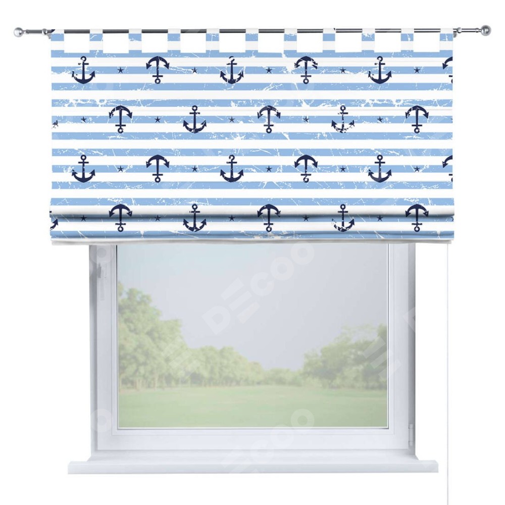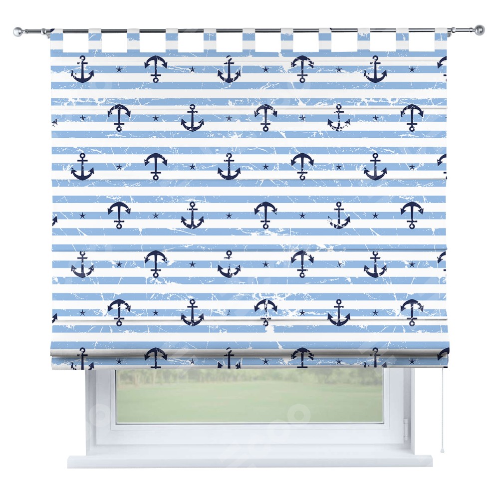 Римская штора производителя «Cortin», используется для проёма, пошита из ткани блэкаут с нанесением сублимационной печати «Полоски и якори». Данная модель пошита на петлях, комплектуется на выбор круглым карнизом и подходит для монтажа на стену. Римская штора на петлях имеет простую систему регулировки высоты, отличительным преимуществом данной модели является простой способ монтажа. Достаточно повесить ее на трубу и штора готова!