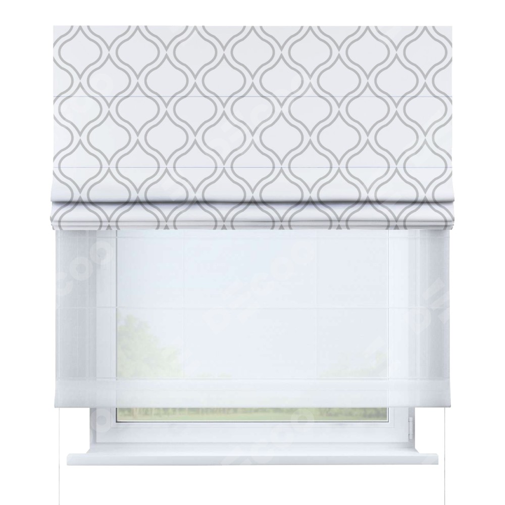 Римская штора день-ночь производителя «Cortin», используется для проёма, пошита из двух полотен, с лицевой блэкаут с нанесением сублимационной печати «Тайны востока белый», вторая ткань тюль (по стандарту комплектуется тюль белого цвета артикул V-01). Имеет универсальный механизм и подходит для монтажа: на потолок, на стену и в нишу.