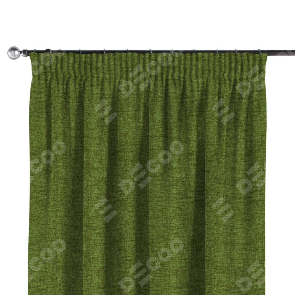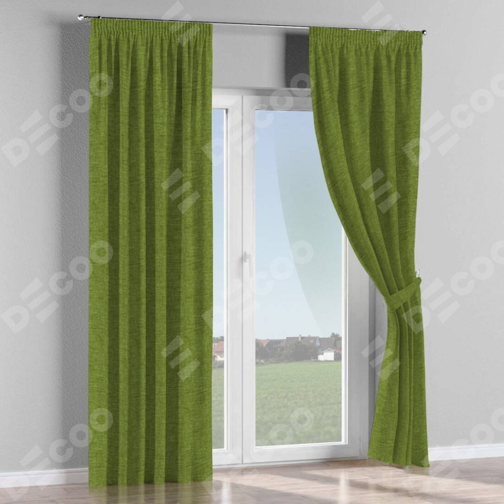Комплект прямых штор, от производителя «Cortin», пошиты из ткани рогожка димаут салатовый, артикул ткани 80423. С изнаночной стороны в верхней части штор пристрачивается шторная лента с декоративными складками «Карандаш». Для создания элегантных складок прямые шторы шьются по стандарту с коэффициентом 1:2 (на 100 см. ширины проёма 200 см. ширины ткани).