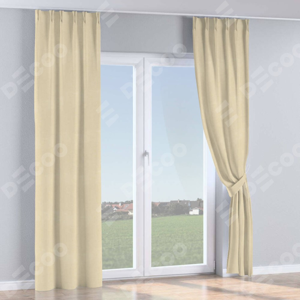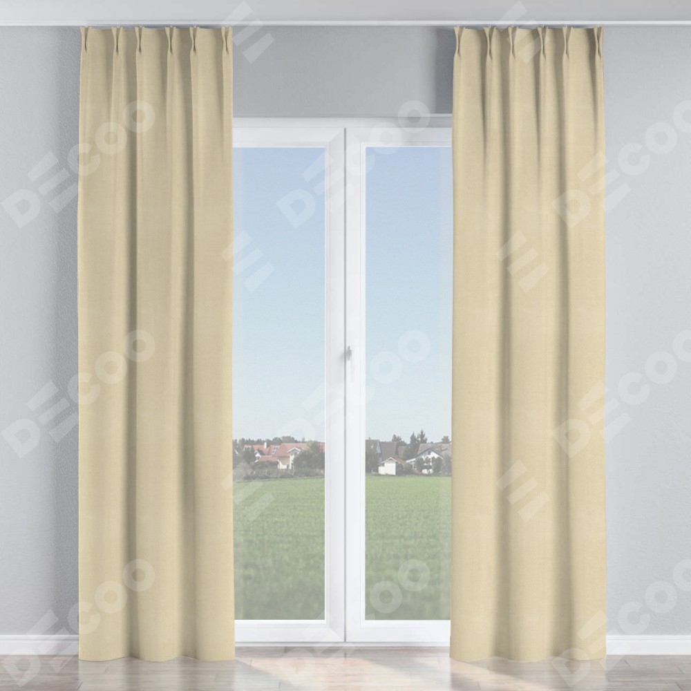 Комплект прямых штор, от производителя «Cortin», пошиты из ткани блэкаут однотонный бежевый, артикул ткани 13125. С изнаночной стороны в верхней части штор пристрачивается шторная лента с декоративными складками «Кустик». Для создания элегантных складок прямые шторы шьются по стандарту с коэффициентом 1:2 (на 100 см. ширины проёма 200 см. ширины ткани).