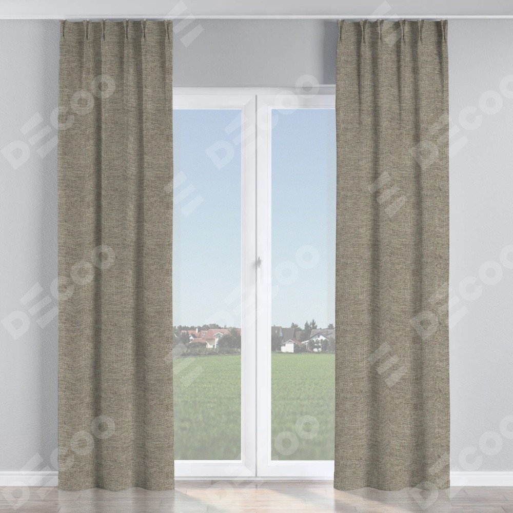 Комплект прямых штор, от производителя «Cortin», пошиты из ткани стиф димаут серо-коричневый, артикул ткани 44028. С изнаночной стороны в верхней части штор пристрачивается шторная лента с декоративными складками «Кустик». Для создания элегантных складок прямые шторы шьются по стандарту с коэффициентом 1:2 (на 100 см. ширины проёма 200 см. ширины ткани).