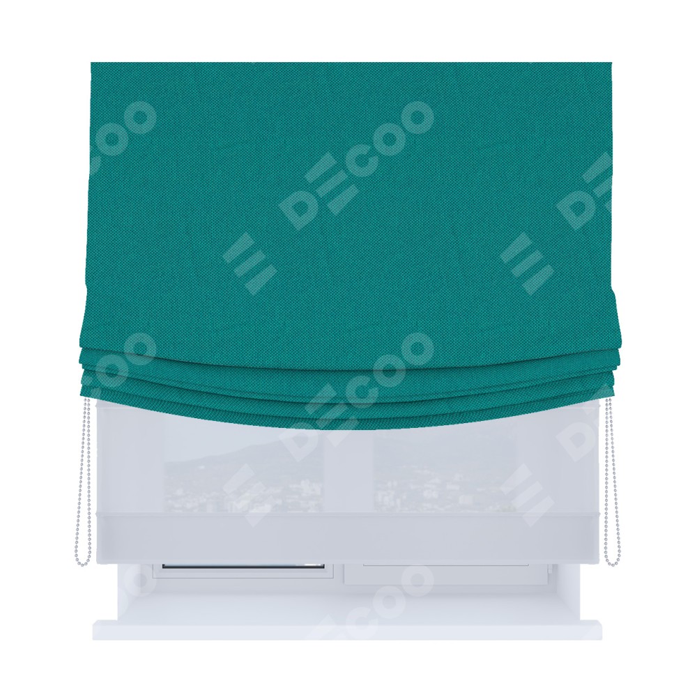Римская штора день-ночь производителя «Cortin», используется для проёма, пошита из двух полотен, с лицевой стороны лён димаут тёмно-бирюзовый артикул 318, вторая ткань тюль (по стандарту комплектуется тюль белого цвета артикул V-01). Имеет универсальный механизм и подходит для монтажа: на потолок, на стену и в нишу. Удобное управление каждой шторой отдельно.