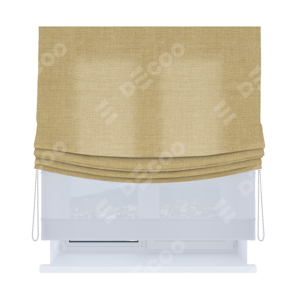 Римская штора день-ночь (двойная) от производителя «Cortin», используется для проёма. Пошита из двух полотен, основная ткань лён бежевый артикул 7442, вторая ткань тюль (по стандарту используется тюль белого цвета артикул V-01). Имеет универсальный механизм и подходит для монтажа: на потолок, на стену и в нишу. Удобное управление каждой шторой отдельно.