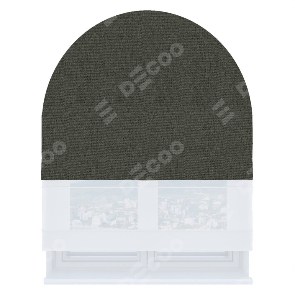 Римская штора день-ночь производителя «Cortin», используется для арочного проёма, пошита из двух полотен, с лицевой стороны твид блэкаут тёмно-серый артикул 21587, вторая ткань тюль (по стандарту комплектуется тюль белого цвета артикул V-01). Штора шьётся по индивидуальным размерам, для данного типа римской шторы возможная ширина от 60 до 300 см. Удобное управление каждой шторой отдельно.