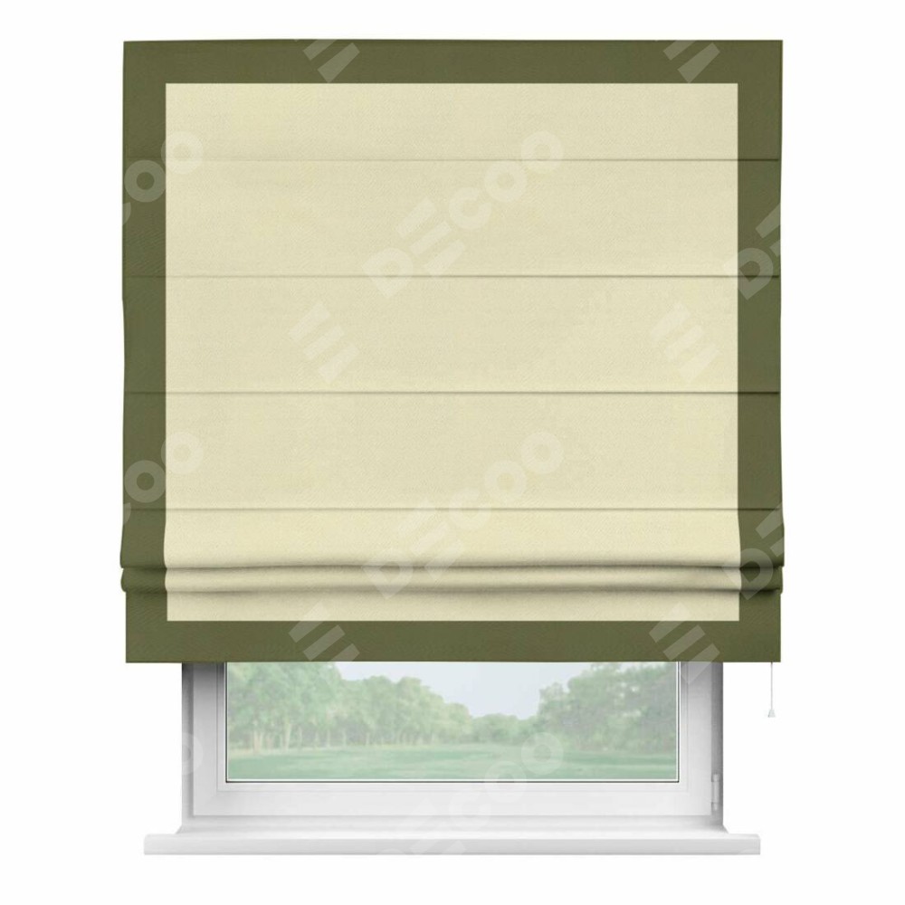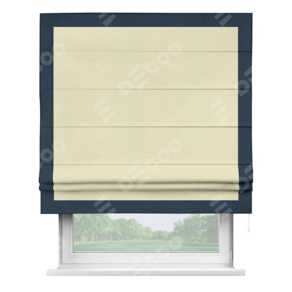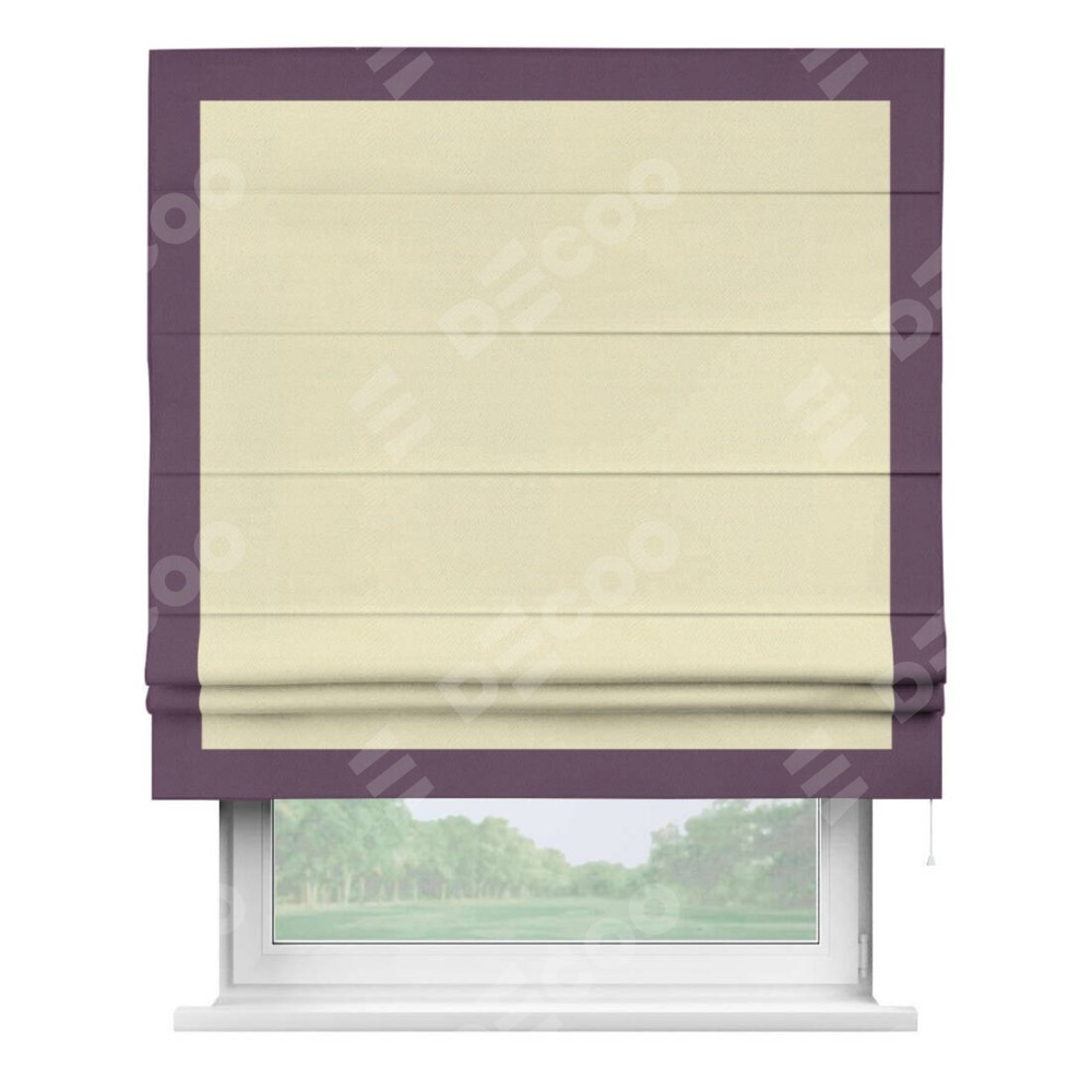 Римская штора производителя «Cortin», используется для проёма, пошита из ткани блэкаут однотонный бежевый, артикул ткани 88283. Отделка шторы кантом «Чесс», ткань для канта используется из блэкаута однотонного разной расцветки на выбор. Имеет универсальный механизм и подходит для монтажа: на потолок, на стену и в нишу.