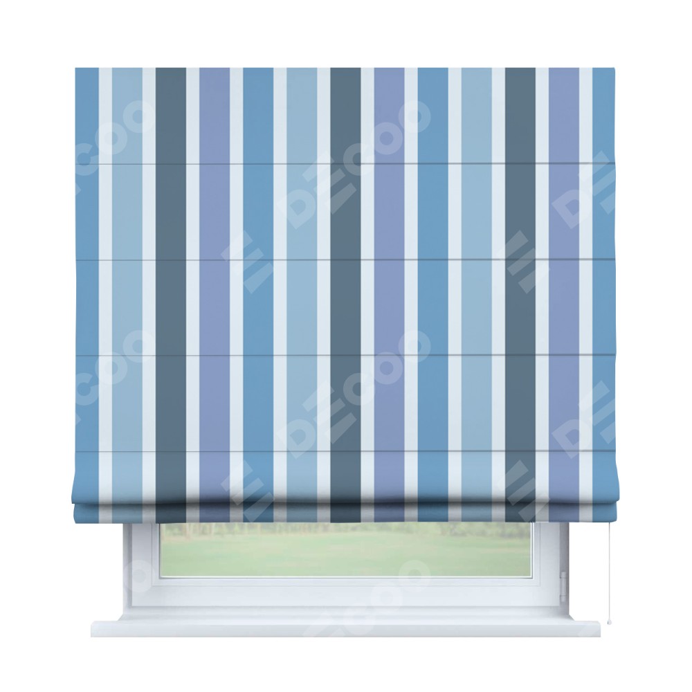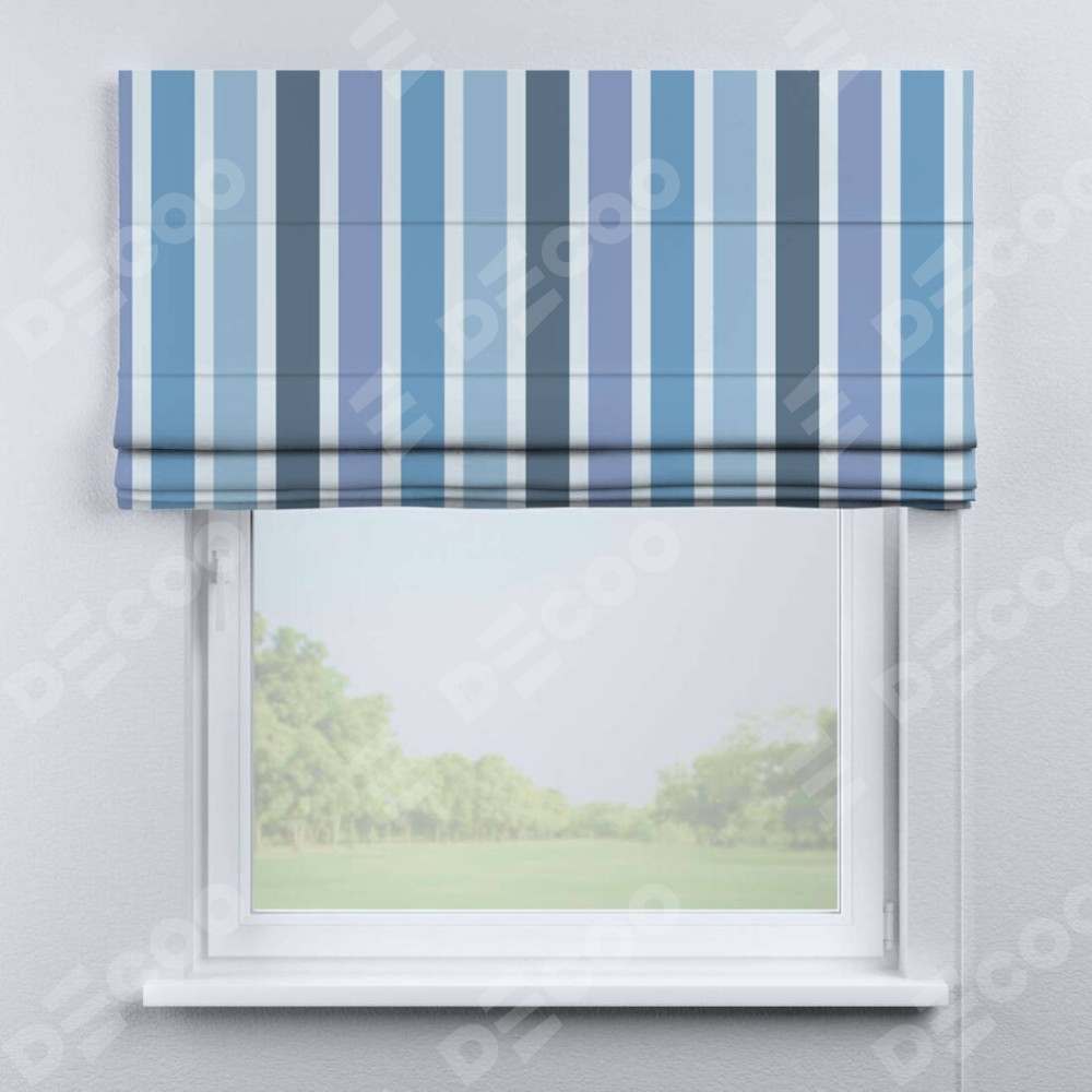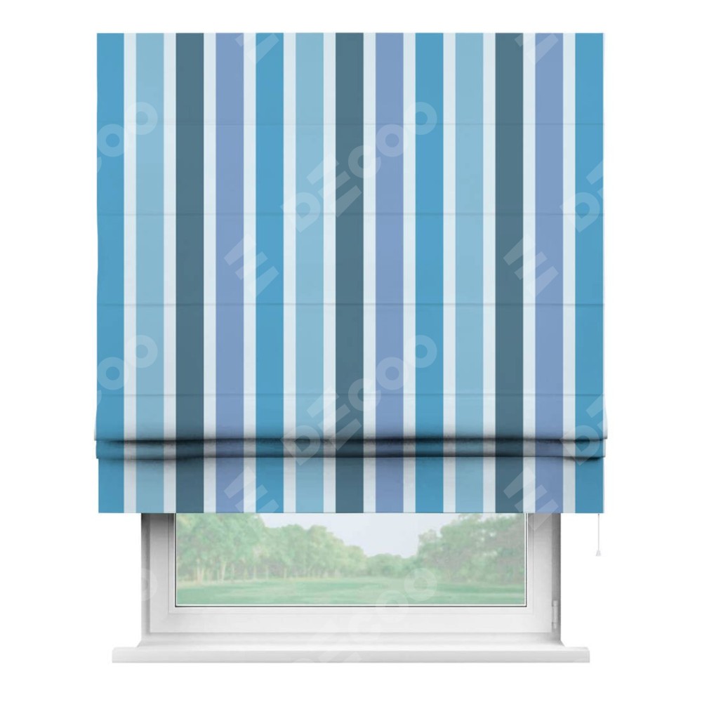 Римская штора «Кортин» для проема «Сине-голубые вертикальные полоски» отлично подойдёт для интерьера: на балкон, в спальню и в гостиную.