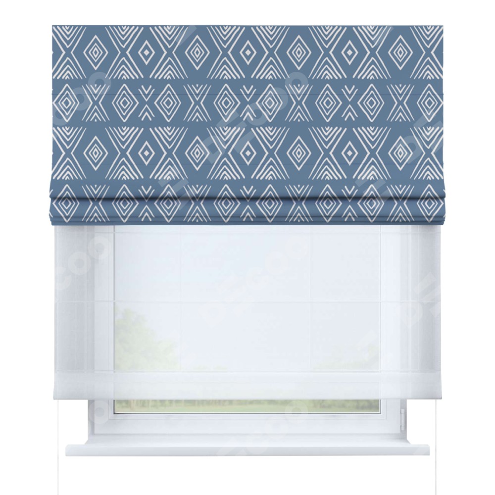 Римская штора день-ночь производителя «Cortin», используется для проёма, пошита из двух полотен, с лицевой блэкаут с нанесением сублимационной печати «Графический орнамент», вторая ткань тюль (по стандарту комплектуется тюль белого цвета артикул V-01). Имеет универсальный механизм и подходит для монтажа: на потолок, на стену и в нишу.