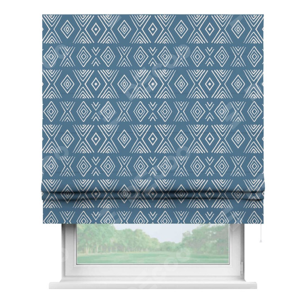 Римская штора производителя «Cortin», используется для проёма, пошита из ткани блэкаут с нанесением сублимационной печати «Графический орнамент». Имеет универсальный механизм и подходит для монтажа: на потолок, на стену и в нишу.