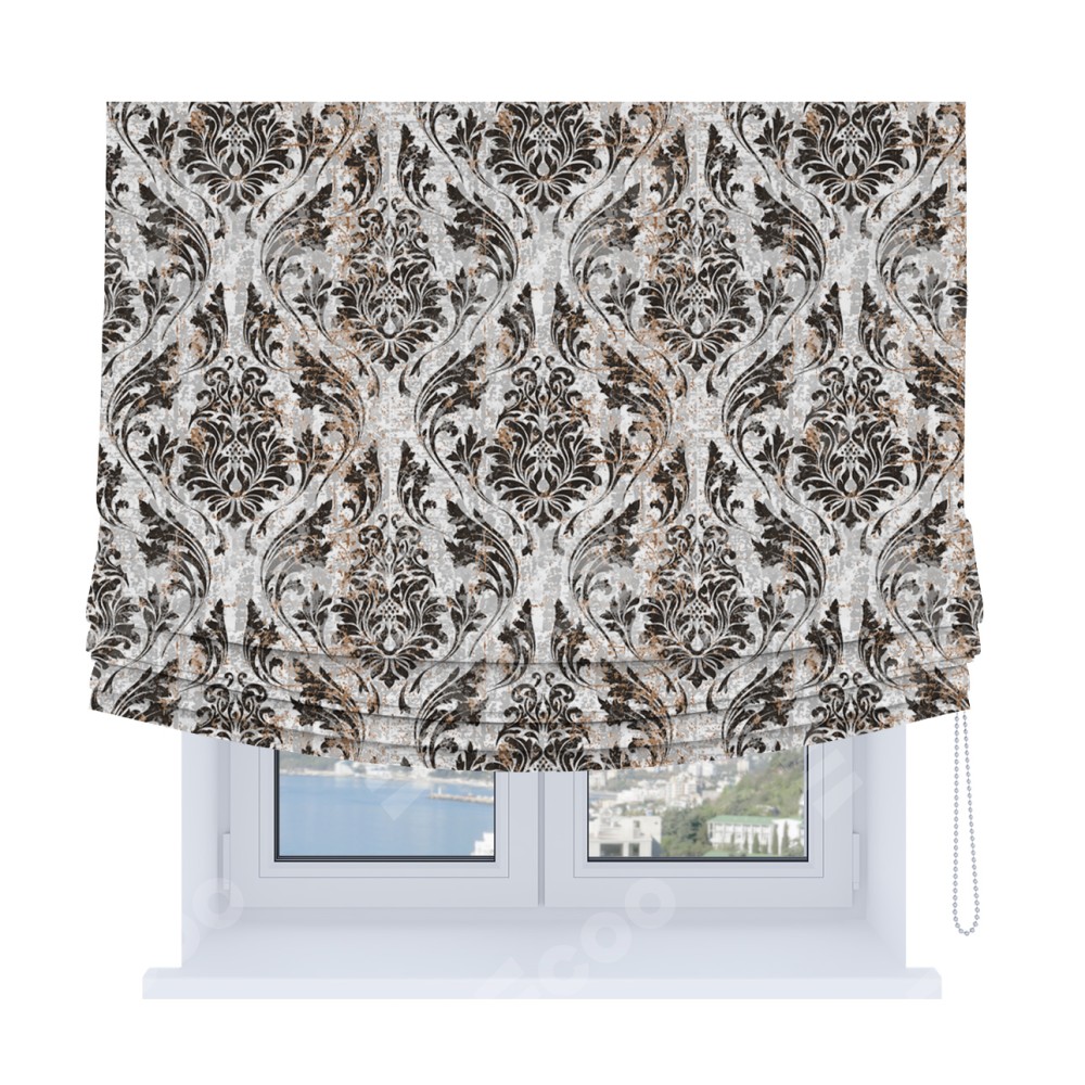 Римская штора Soft производителя «Cortin», используется для проёма, пошита из ткани блэкаут с нанесением сублимационной печати «Дамаск тёмный». Имеет универсальный механизм и подходит для монтажа: на потолок, на стену и в нишу. В отличие от стандартных римских штор, римская штора Soft не имеет горизонтальных вставок и нижнего отвеса. Это позволяет ткани произвольно драпироваться в свободные мягкие складки.