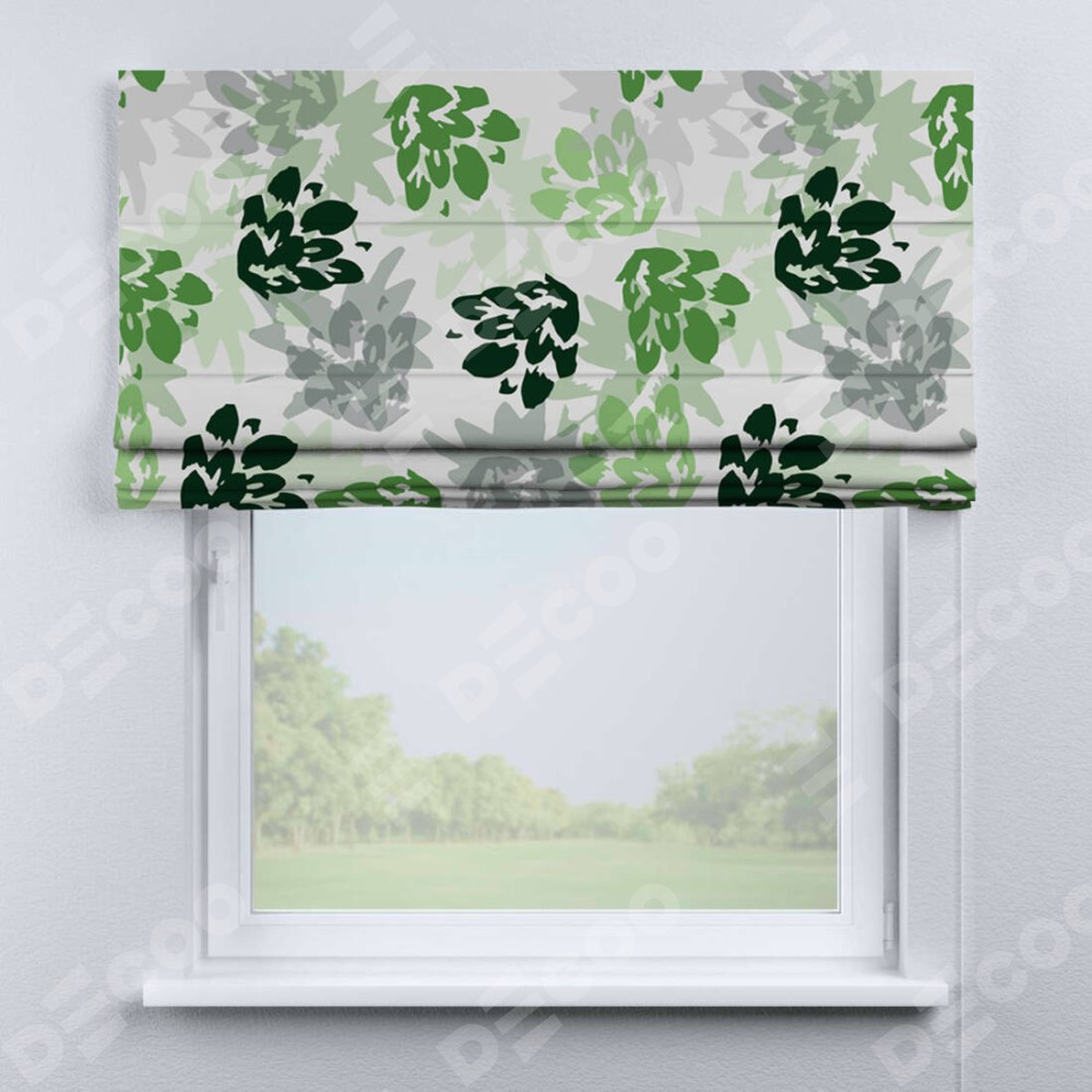 Римская штора производителя «Cortin», используется для проёма, пошита из ткани блэкаут с нанесением сублимационной печати «Зелёный луг». Имеет универсальный механизм и подходит для монтажа: на потолок, на стену и в нишу.