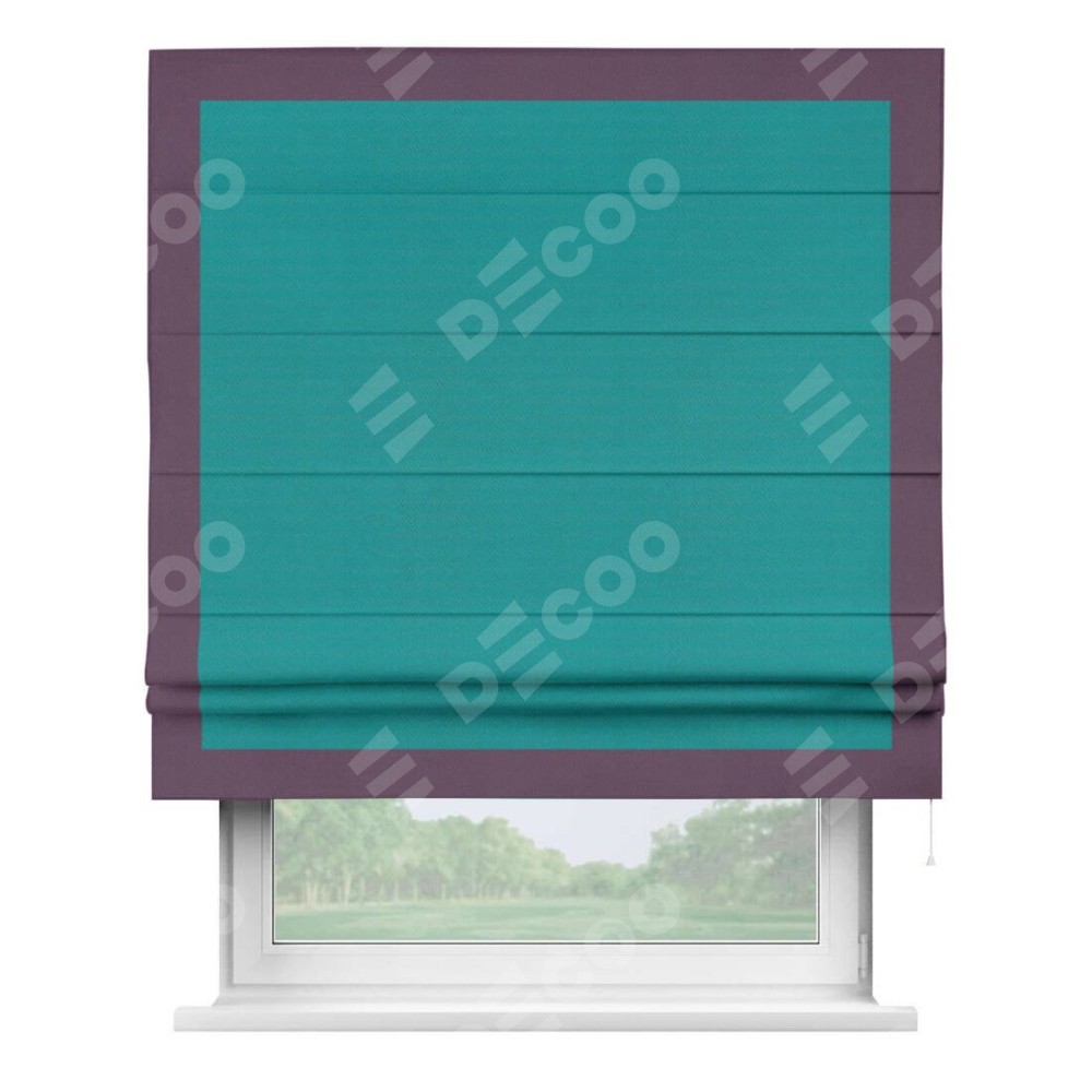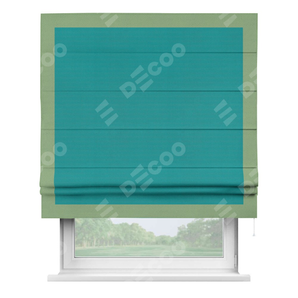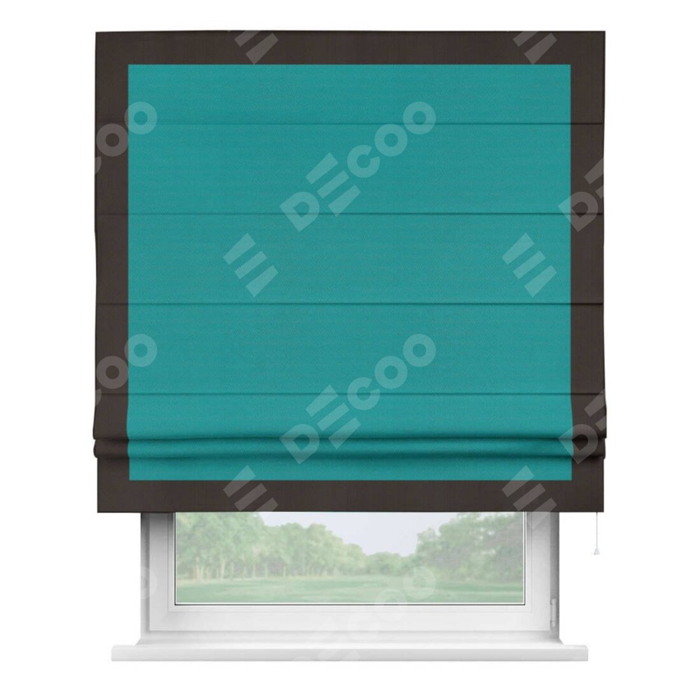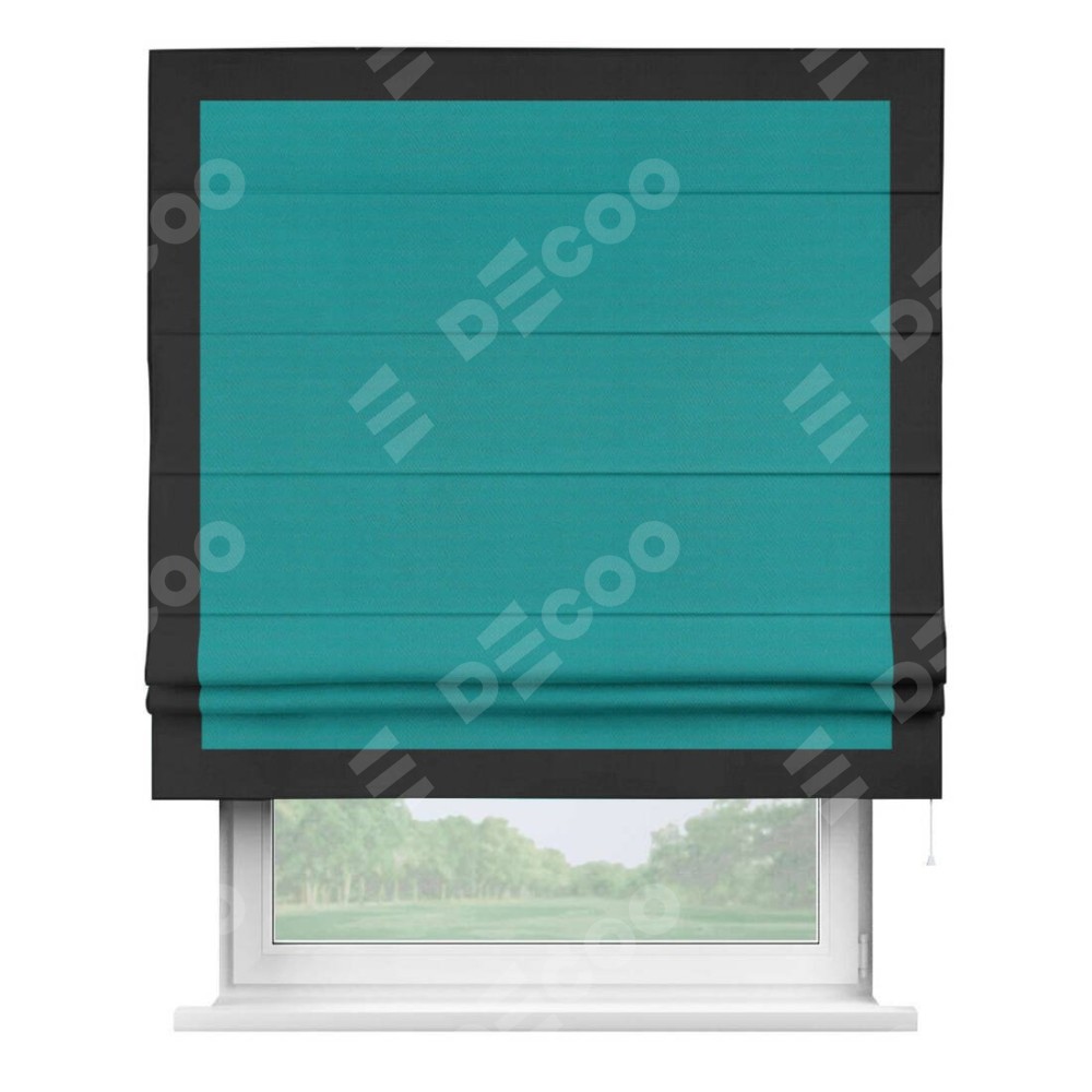 Римская штора производителя «Cortin», используется для проёма, пошита из ткани блэкаут однотонный бирюзовый, артикул ткани 88297. Отделка шторы кантом «Чесс», ткань для канта используется из блэкаута однотонного разной расцветки на выбор. Имеет универсальный механизм и подходит для монтажа: на потолок, на стену и в нишу.